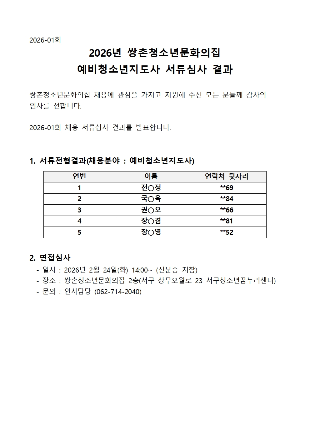 | 2026년 쌍촌청소년문화의집 예비청소년지도사 서류심사 결과 발표 | |