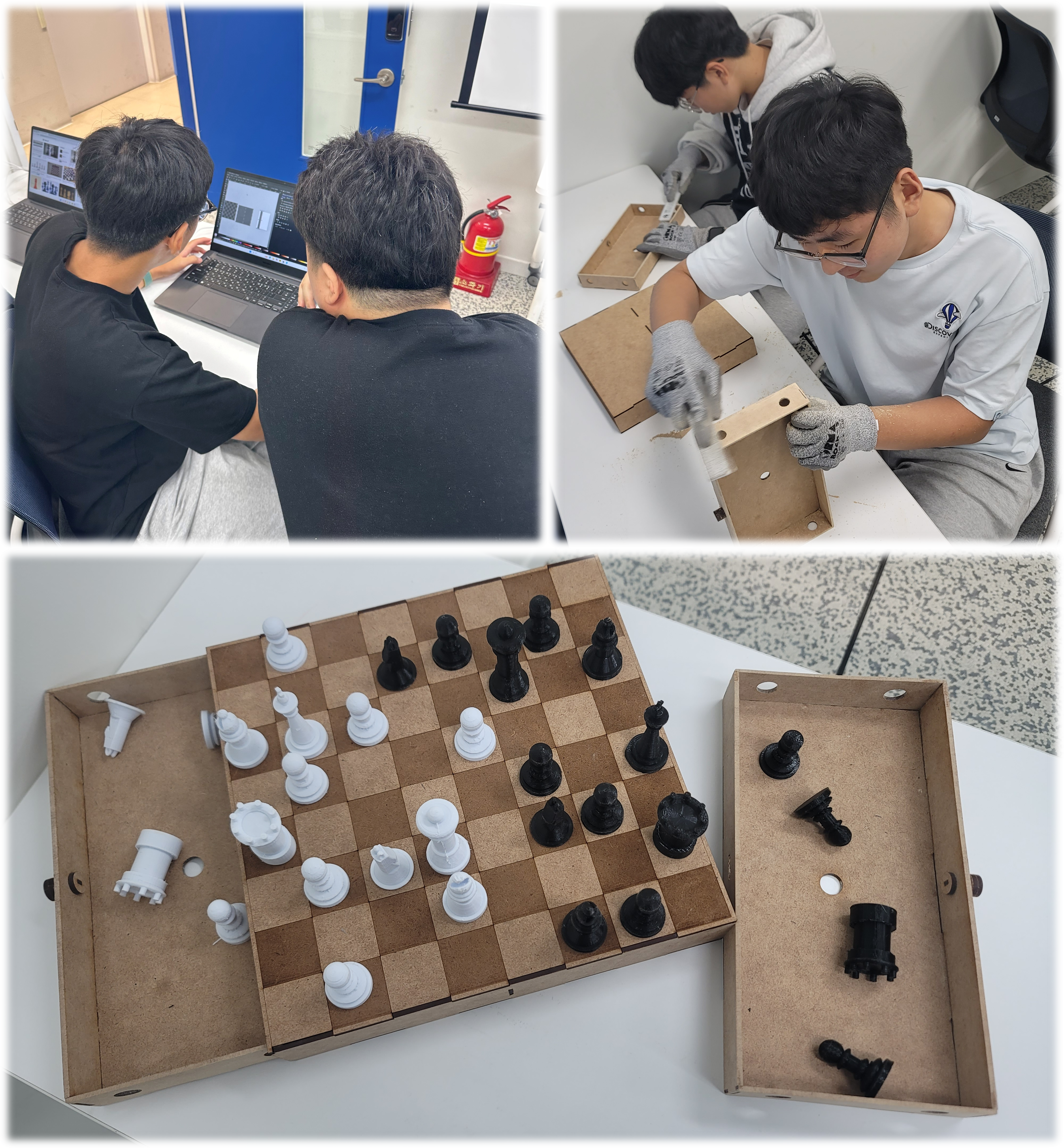 보드게임 팀은 '체스'를 만들었어요! 3D프린터로 체스 말을 만들고 레이저조각기로 체스말을 보관할 수 있는 서랍과 판을 제작해 디테일한 표현력을 보여줬답니다 :)