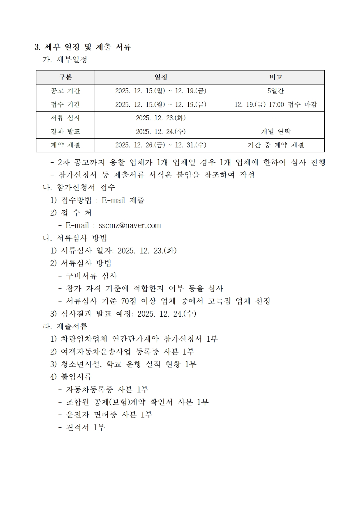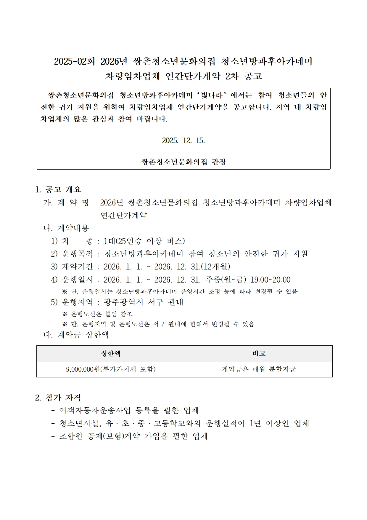 | 2025-02회 쌍촌청소년문화의집 청소년방과후아카데미 차량임차업체 연간단가계약 2차 공고 | |