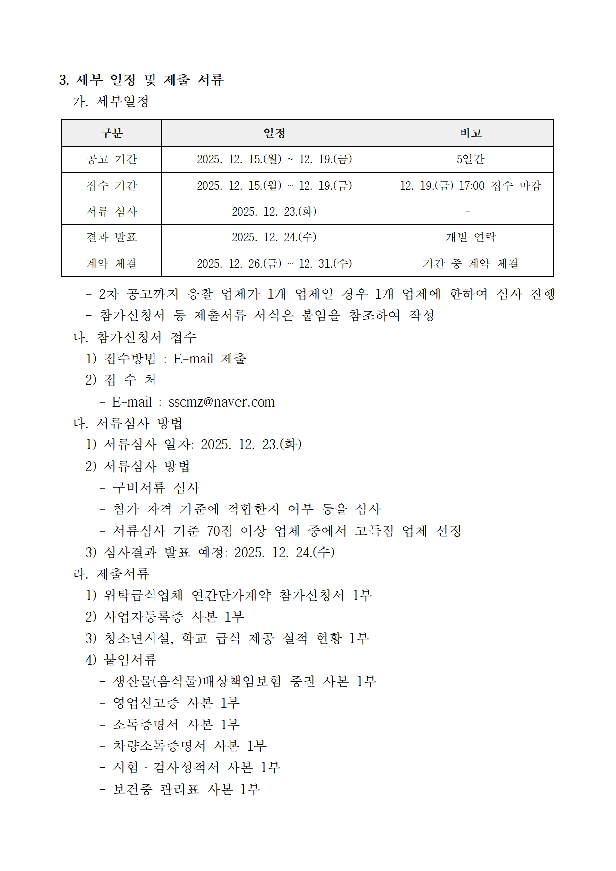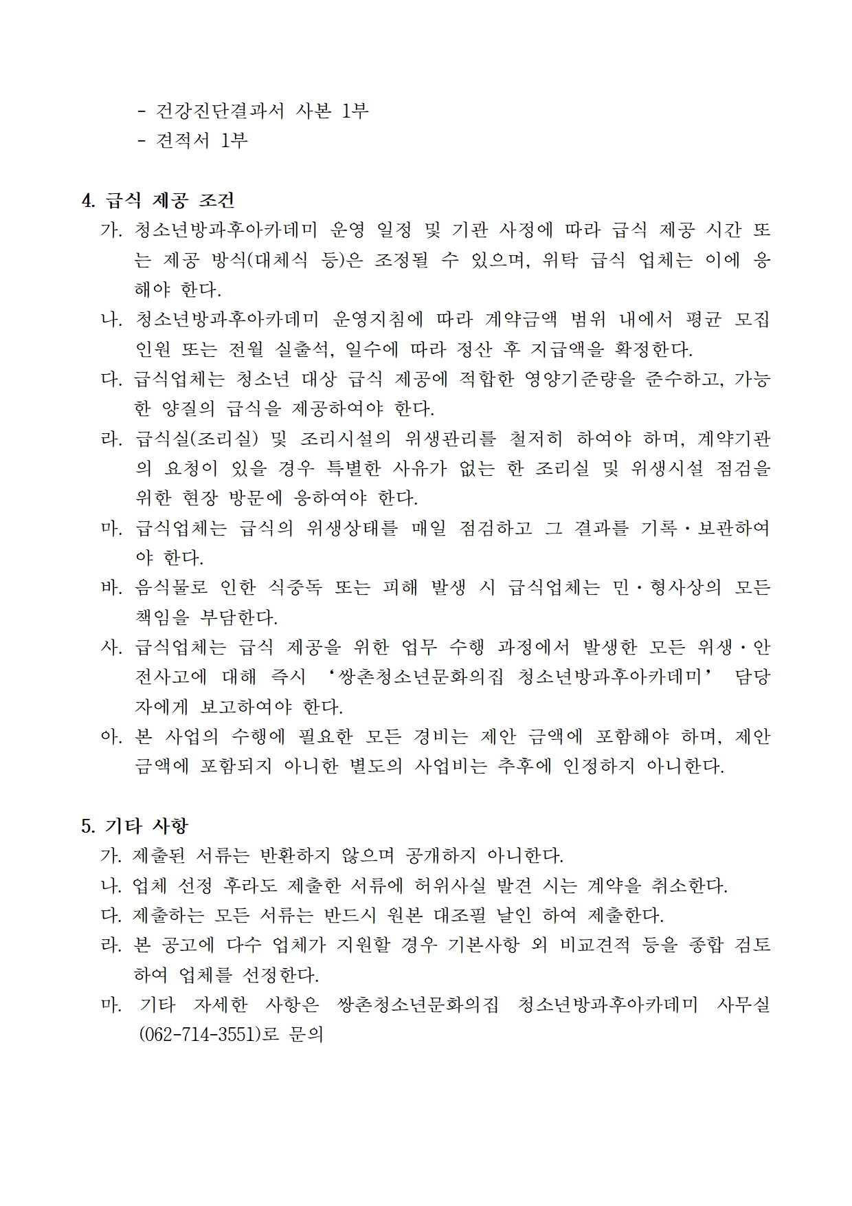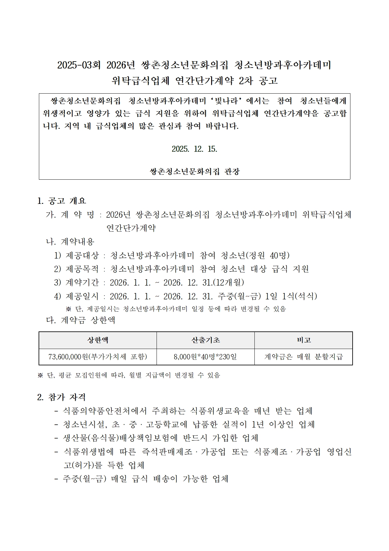 | 2025-03회 쌍촌청소년문화의집 청소년방과후아카데미 위탁급식업체 연간단가계약 2차 공고 | |