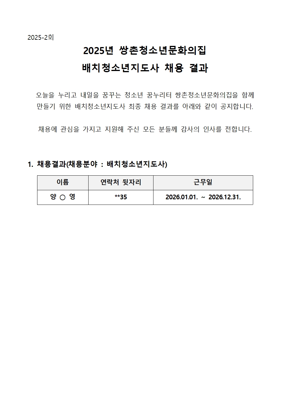 | 2025년 쌍촌청소년문화의집 배치청소년지도사 채용 결과 | |