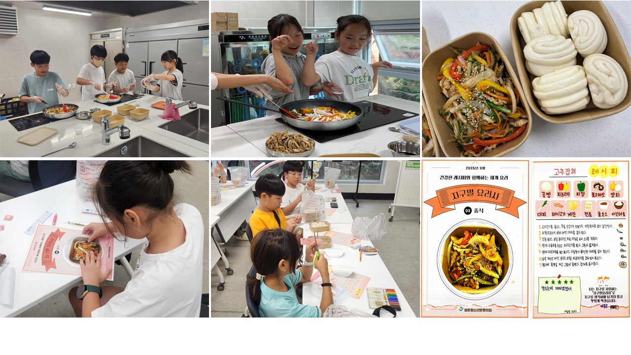 건강한 식습관과 세계 음식문화를 알고 직접 식재료를 손질하고 볶아 음식을 만들었어요! 처음엔 평소 즐겨 먹지 않는 식재료여서 거부감이 있었지만 직접 만들어 맛 보니 더 맛있게 먹었답니다ㅎㅎ 만들어본 레시피를 집에서도 활용할 수 있도록 재료, 순서, 소감 등을 넣은 레시피북도 만들었어요 :) 남기지 않고 맛있게 먹겠다는 약속이 담긴 인증샷까지!